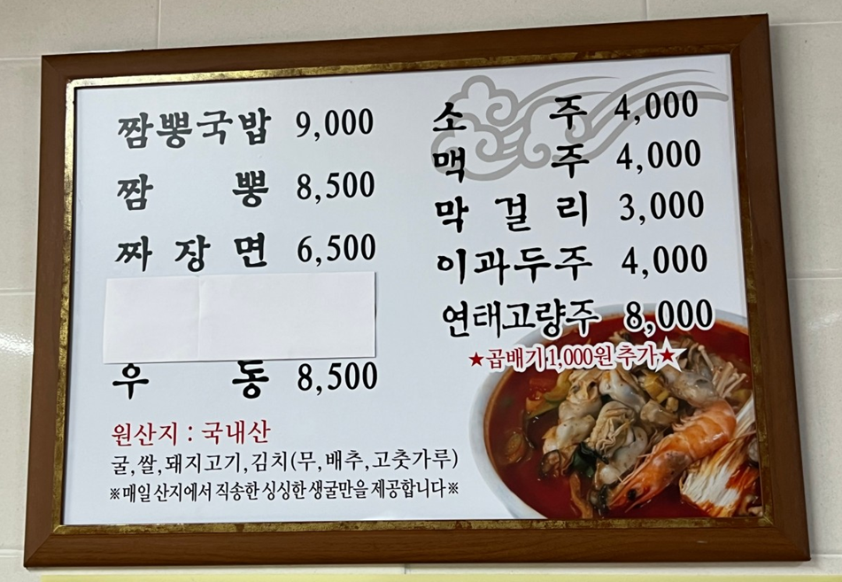 | 짬뽕국밥 | 9,000원 | 밥 + 짬뽕 국물 구성 |