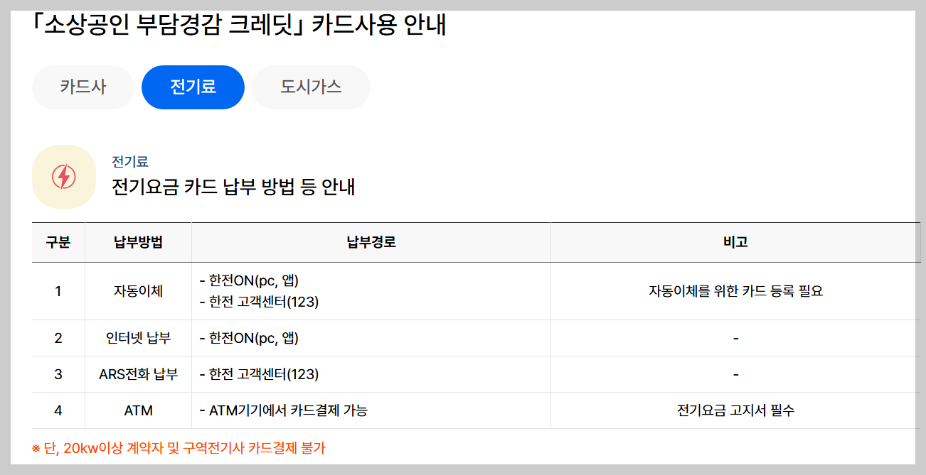 - 20kW 이상 사업자 및 구역전기사 고객은 카드결제 불가 → 크레딧 미적용