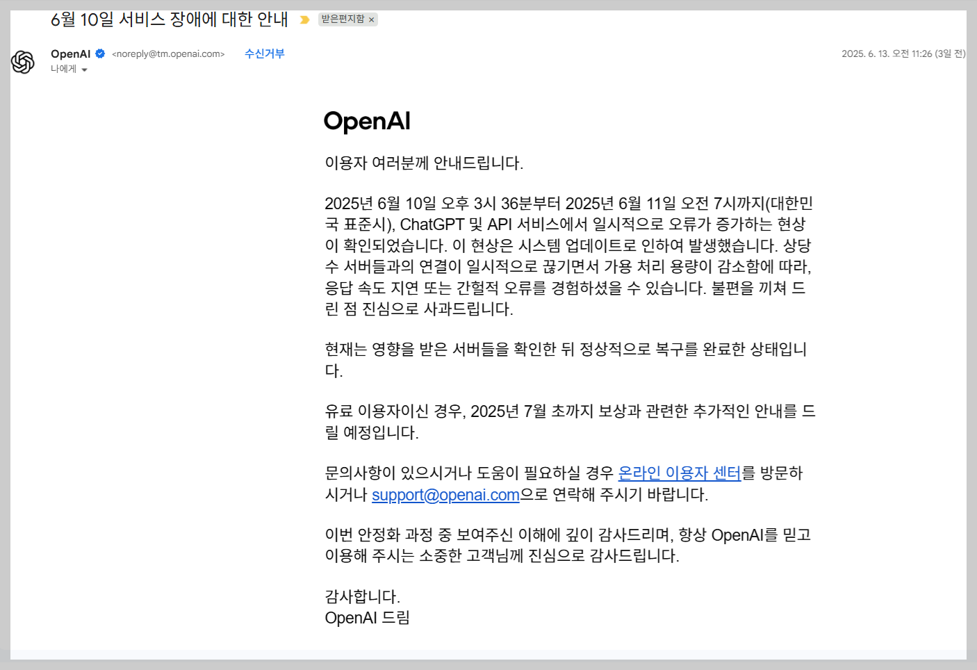 이번 오류는 OpenAI 측 시스템 업데이트 과정에서 발생한 일시적인 서버 장애였으며, 이후 공식 사과 및 유료 사용자 보상 방침이 발표되었습니다.