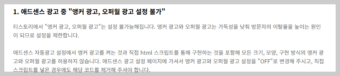 티스토리는 이 두 광고 유형이 블로그 가독성을 해치고, UX에 악영향을 준다고 판단해 사용 자체를 금지합니다.